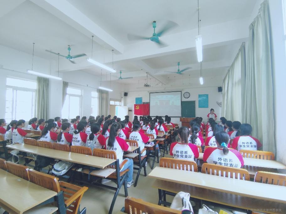 外语系学生党支部书记韦博文老师强调,青年党员及团员要肩负起民族振兴的责任,要用党的科学理论武装头脑,要用党的初心使命改造思想,要用党的光辉旗帜指引方向,自觉在行动上践行青春使命。