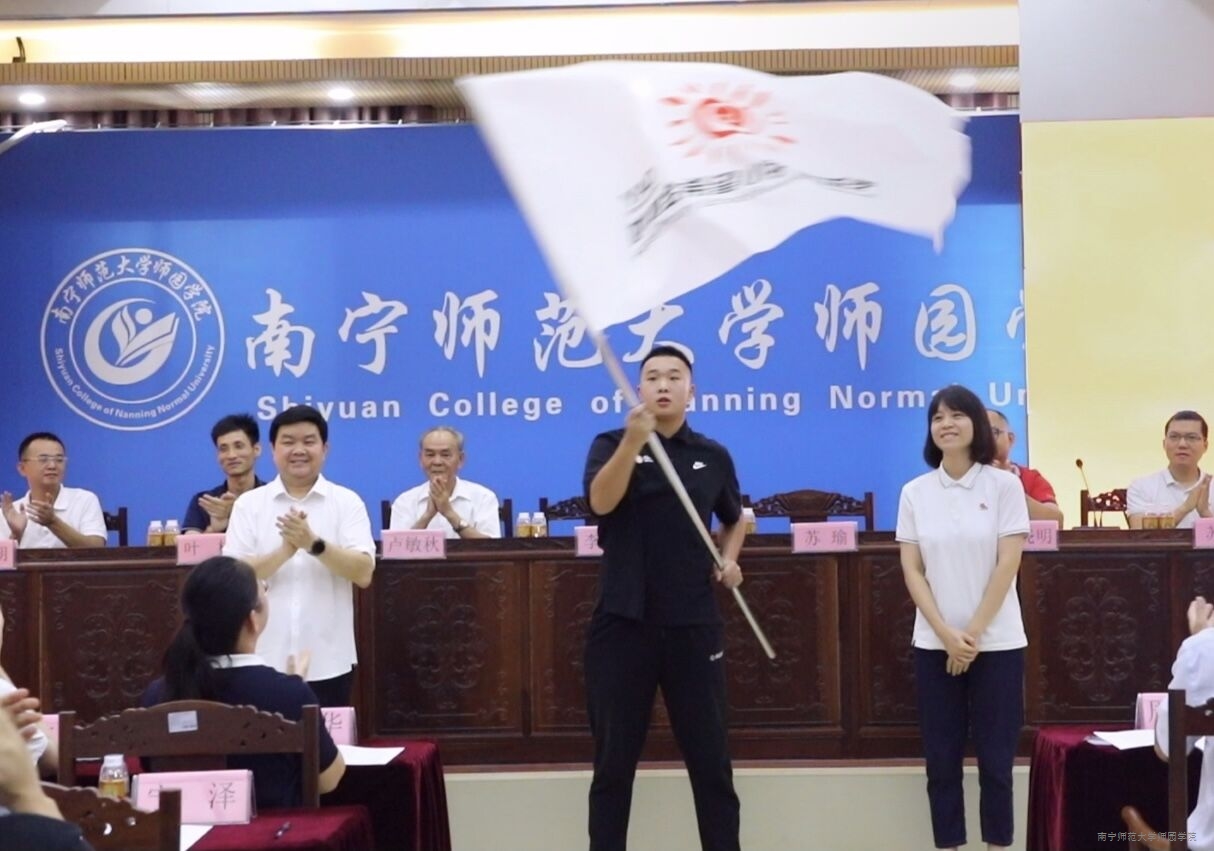 出征仪式上,苏瑜秘书长将象征着奉献和服务的志愿者旗帜授予我院,李剑喜常务副院长郑重地将旗帜交到支教志愿者代表手中,传递志愿服务精神。随后,全体支教志愿者们面对志愿者旗帜庄严宣誓,宏伟的誓言将整个出征仪式推向了最高潮。