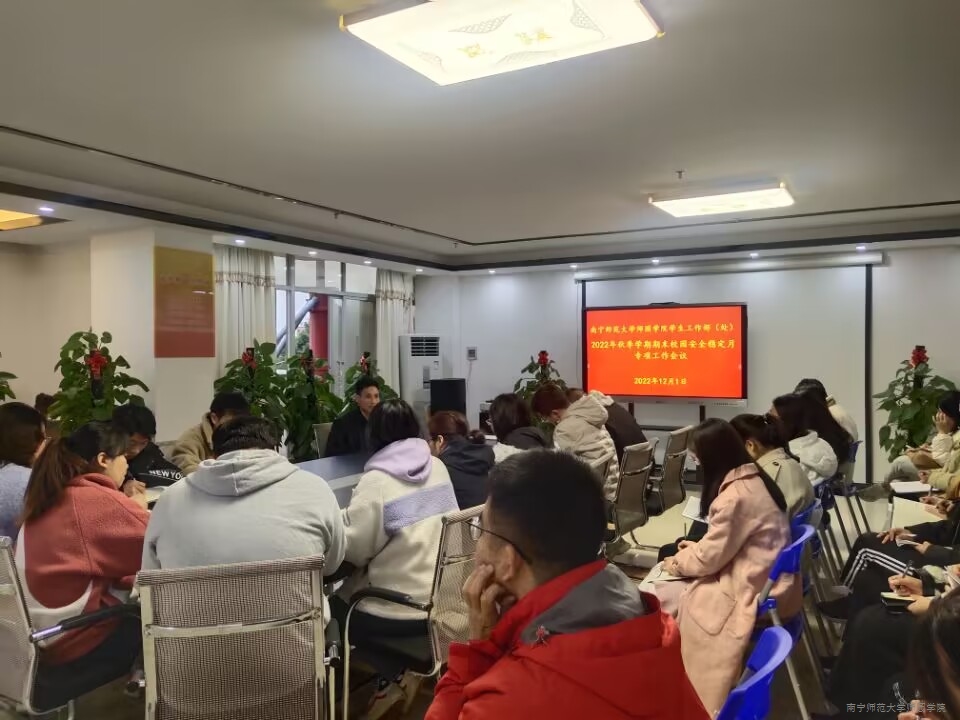 为保障全院师生生命财产安全,维护正常的教育教学秩序,进一步做好校园安全维稳工作,12月1日下午,学工处在行政综合楼2楼202会议室召开2022年秋季学期期末校园安全稳定月专项工作会议。学工系统全体人员参加会议,会议由学工处处长叶栋主持。