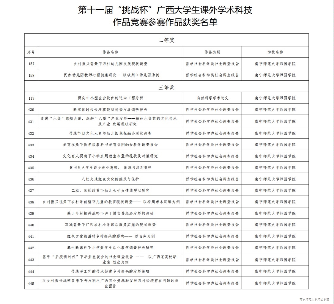 据悉,本届区赛共收到来自全区70所院校提交的1473件参赛作品,涵盖自然科学学术论文、哲学社会科学调查报告、科技发明三个领域。我院高度重视组织学生参加该项赛事,并择优推报至区赛作品25件。经过校级初赛、区级复赛、答辩评审和组委会、评委会综合审定,我院《乡村振兴背景下农村幼儿园发展现状调查》《民办幼儿园教师心理健康研究-以钦州市幼儿园为例》2个项目荣获区赛二等奖,《面向中小型企业软件的逆向工程分析》等17个项目喜获区赛三等奖,获奖率达76%,参赛数量与获奖数量均创历史新高。