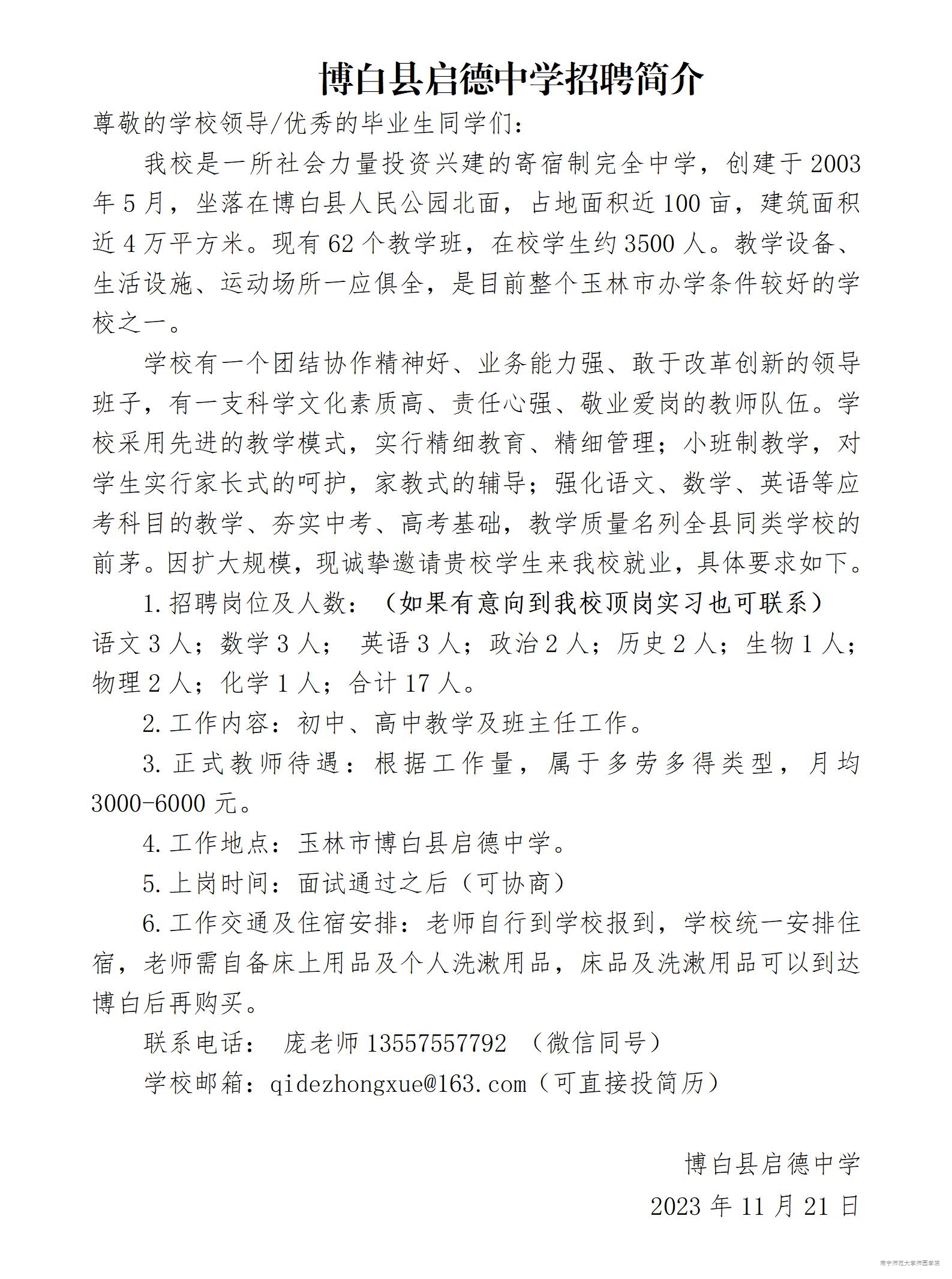 博白县启德中学招聘简介
