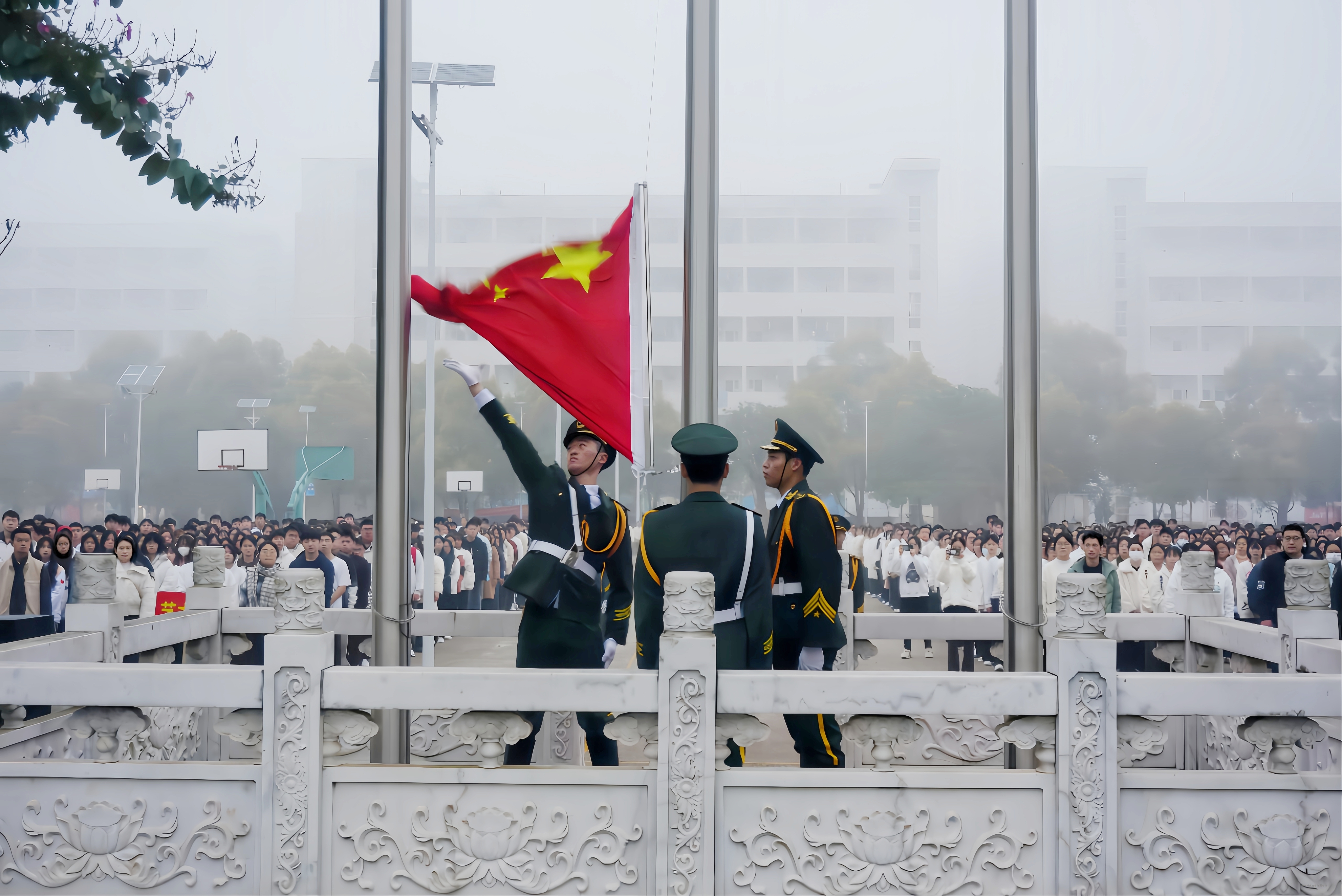 当天清晨,国旗护卫队的旗手们迈着坚定有力的步伐,护送五星红旗走向升旗台。鲜艳的五星红旗在慷慨激昂的国歌声中冉冉升起,全体师生面向国旗庄严肃立,行注目礼。