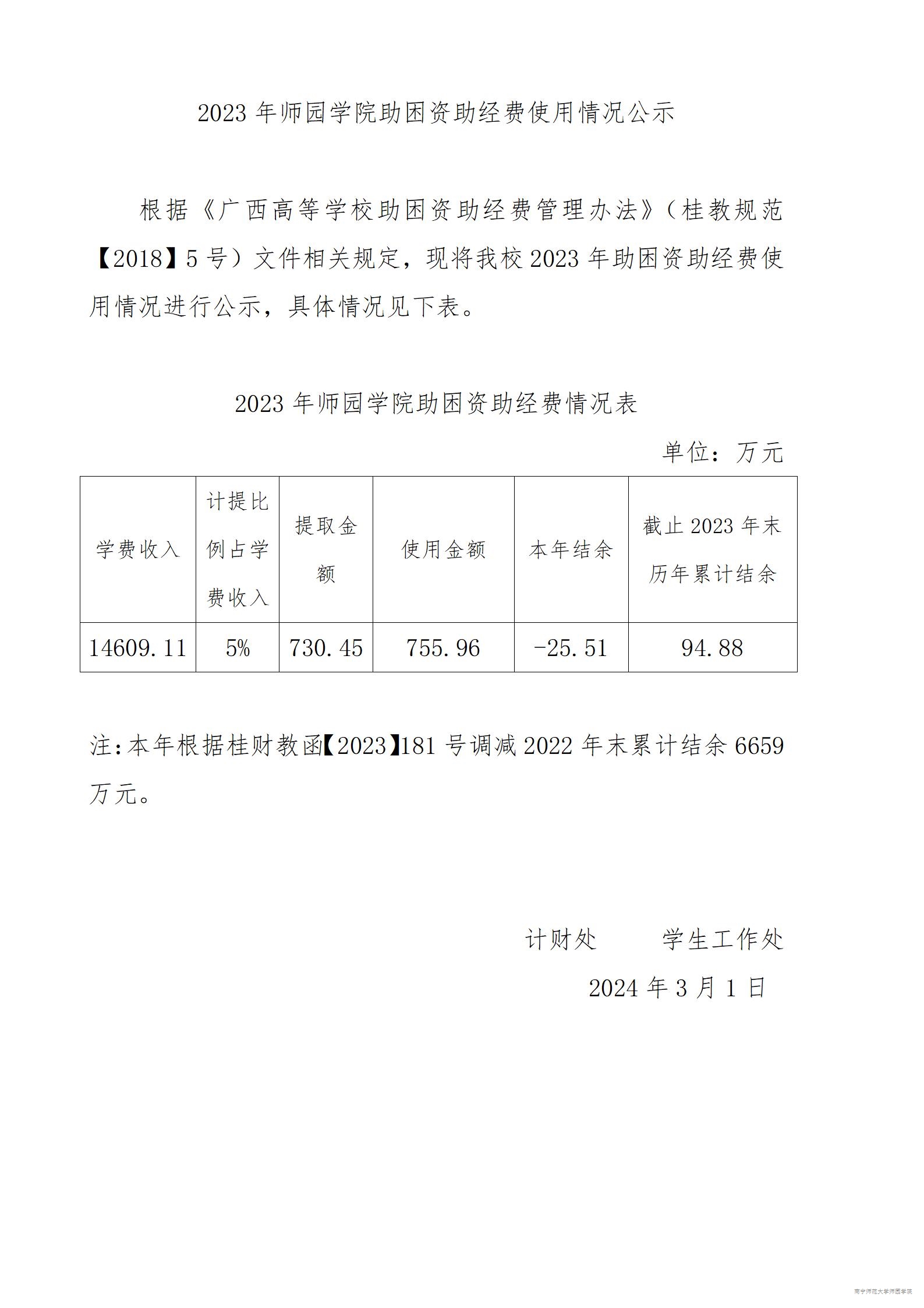 2023年师园学院助困资助经费使用情况公示