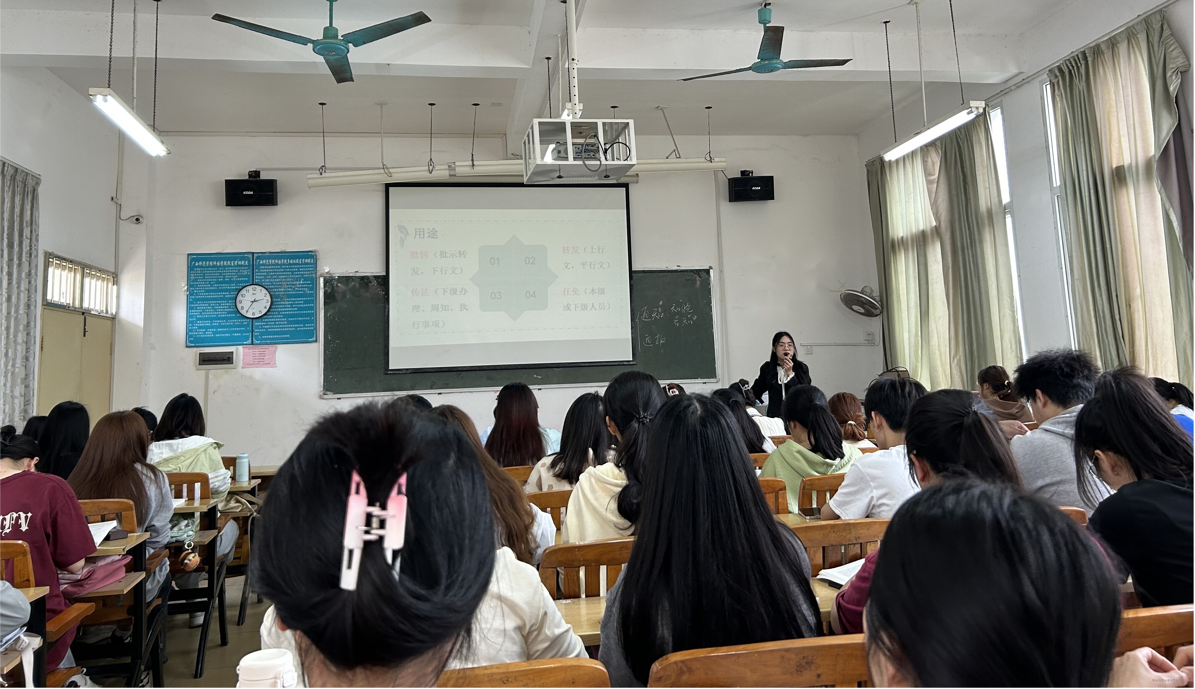 为积极响应学院教学质量提升月号召,提升中文系教育教学质量,4月8日下午,中文系在教学楼3-307教室开展《应用文写作》课程教学公开课。中文系主任骆柳毅与教师代表参加听课、评课活动。