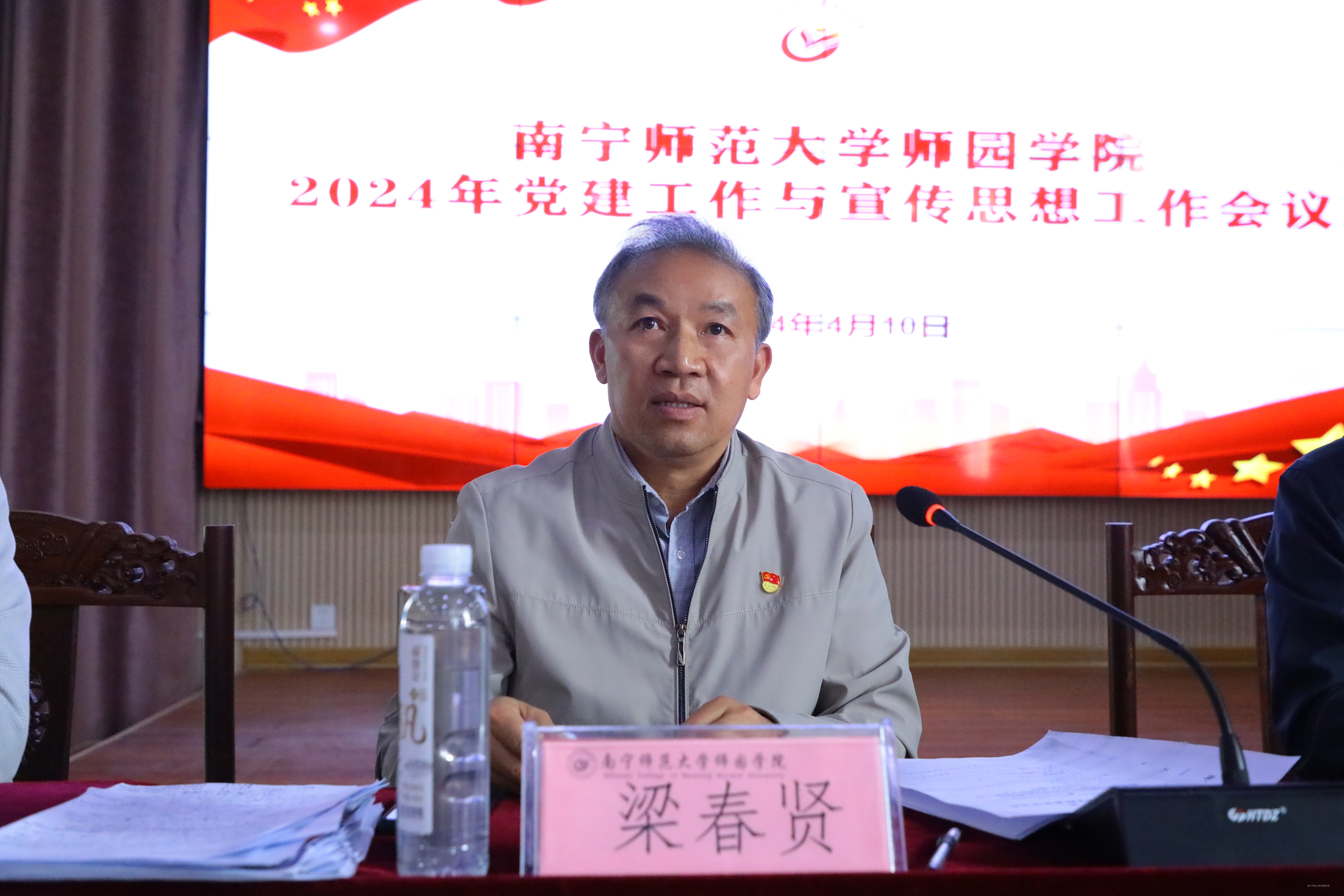 随后,梁春贤书记总结了学院2023年党的建设和宣传思想工作,并就2024年重点工作任务进行了部署:一是严格落实第一议题制度,以学院党委层面学习带动基层党组织党员学习;二是贯彻落实《中国共产党普通高等学校基层党组织工作条例》和《全区民办学校党建工作要点》等工作要求,全面推进“五基三化”工作;三是加强院系党建工作和宣传思想工作队伍的建设,做好2024年落实意识形态工作主体责任书签订工作,层层落实主体责任。