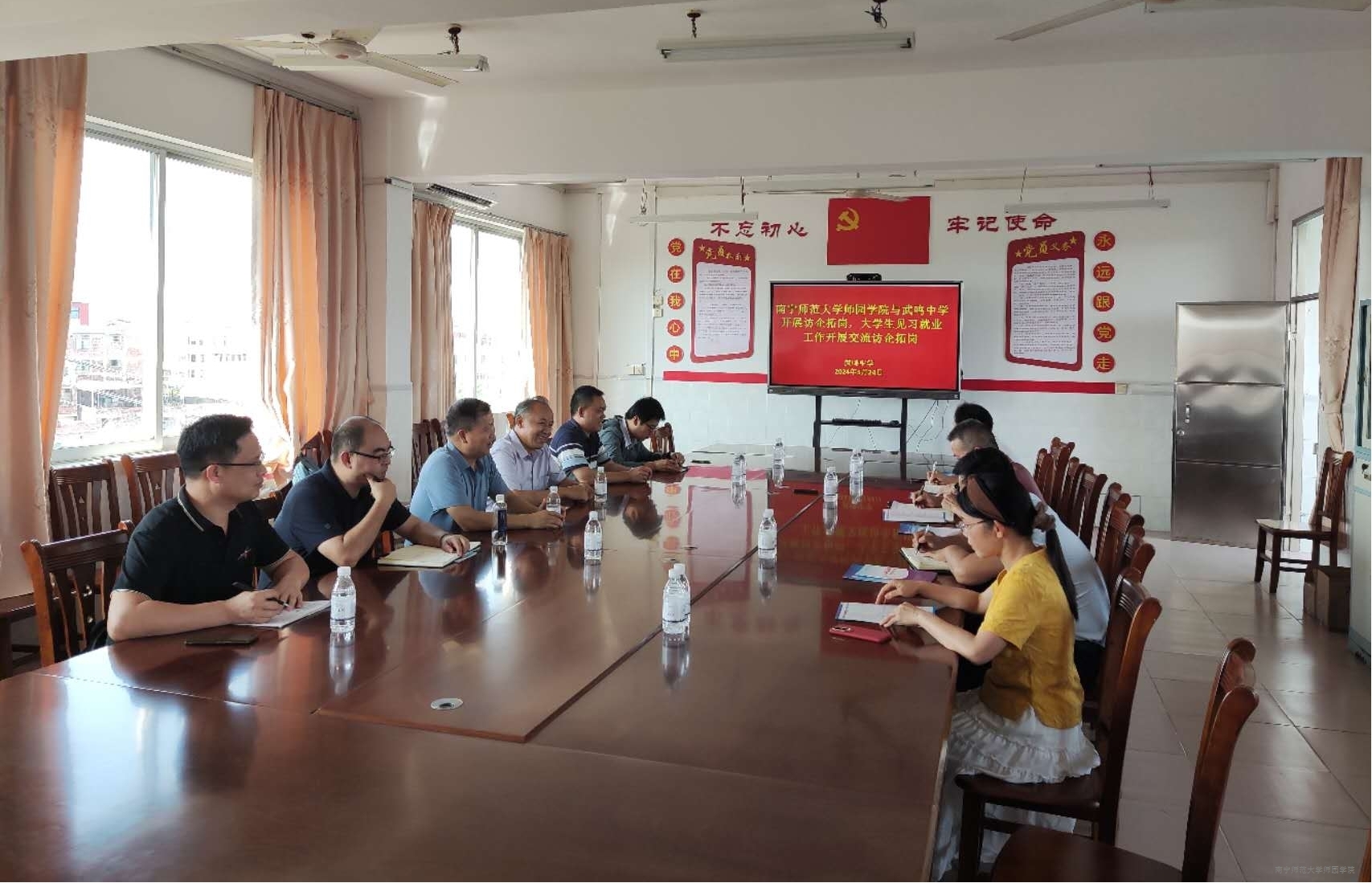 为深入贯彻落实教育部、教育厅关于“访企拓岗促就业”专项行动的要求,强化校校合作,拓宽毕业生就业岗位供给,促进学院2024届毕业生高质量就业,5月24日,学院党委书记梁春贤率领招生就业处、理工系、艺术系负责人先后赴南宁市武鸣中学、南宁市央美附属高级中学开展访企拓岗调研活动。