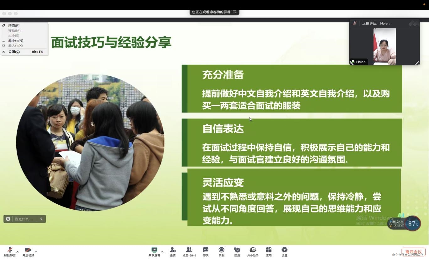 为深入细致做好学生实习、毕业生就业工作,5月30日晚,外语系在腾讯会议平台召开求职就业经验分享会。会议邀请了2023届校友廖春梅和黄子铟进行就业经验分享。会议由外语系学工组组长黄永丽主持,外语系2020级、2022级专升本学生参加。
