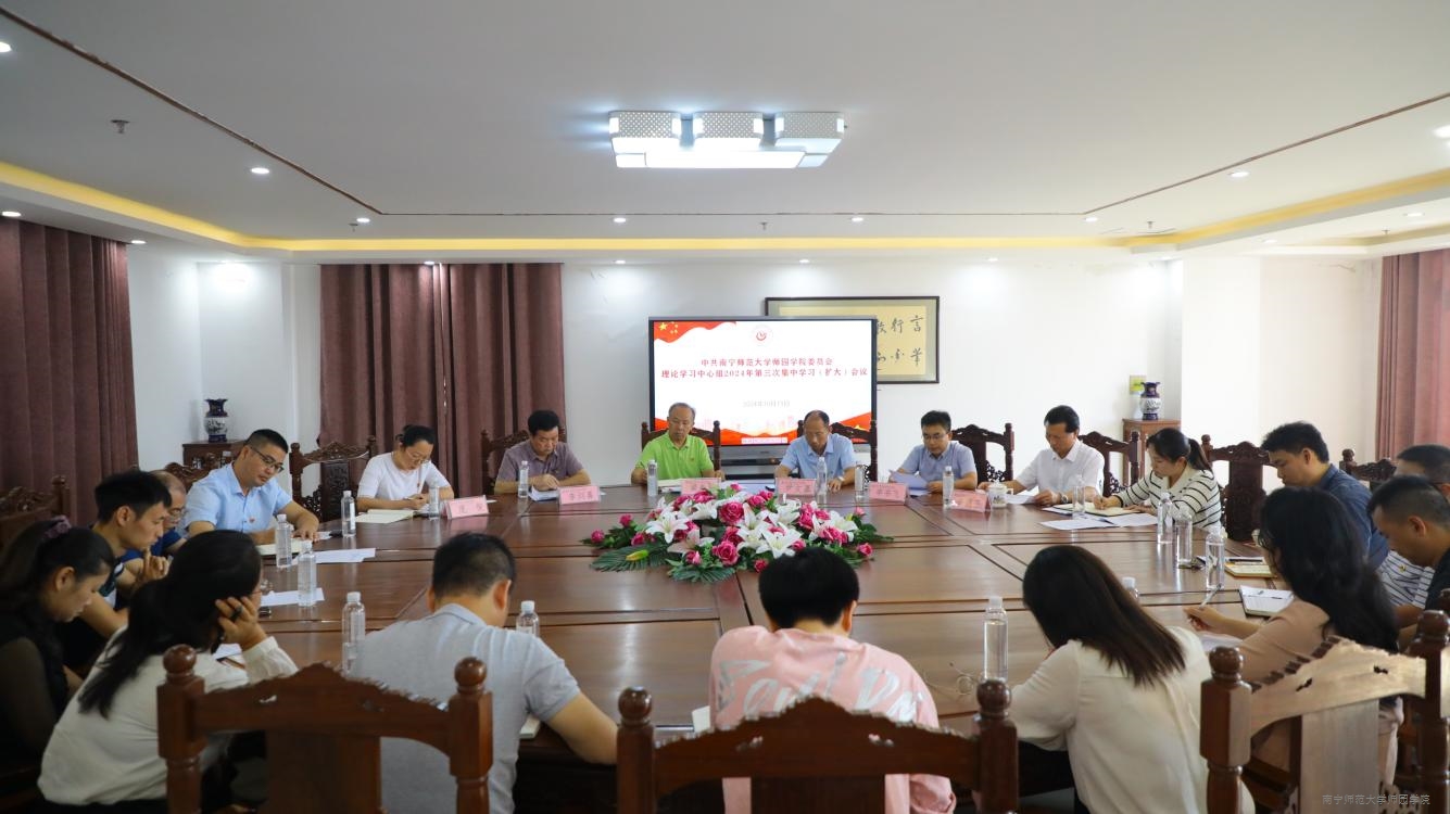 10月11日上午,我院在行政综合10楼1002会议室召开学院党委理论学习中心组2024年第三次集中学习(扩大)会议。学院党委书记梁春贤、全体学院党委委员,以及院长尹文嘉;党政事务部、组织宣传部、教师工作部、学生工作部、团委、武装部负责人;各党总支书记及直属党支部书记参加会议,副院长李德正列席会议。会议由梁春贤书记主持。