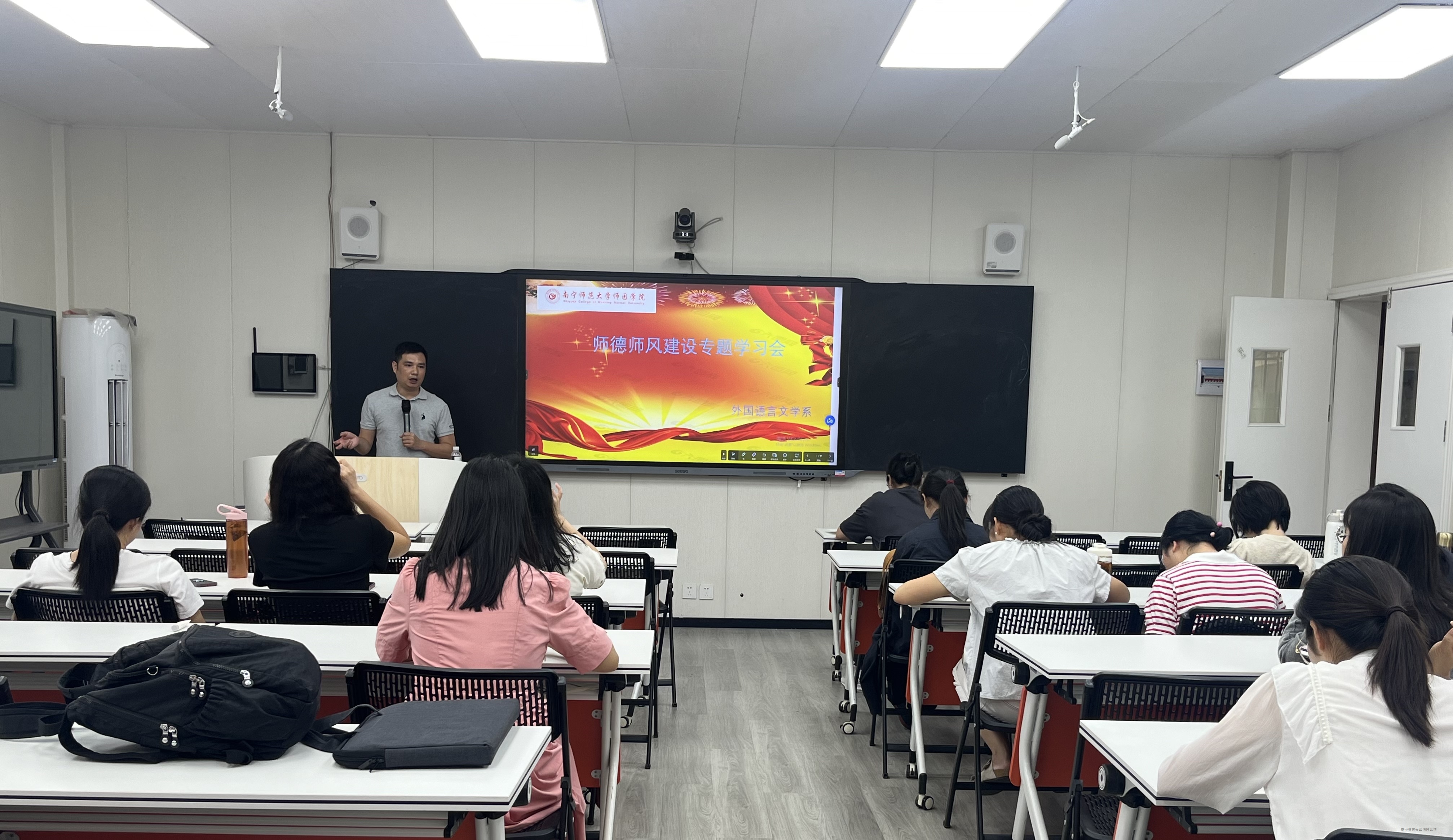为进一步加强师德师风建设,着力提升教师思想政治素质,建设一支师德高尚的教师队伍,10月23日下午,外语系在教学楼4-104教室召开师德师风专题学习会。外语系全体教职员工参加会议,会议由外语系主任苏道佳主持。