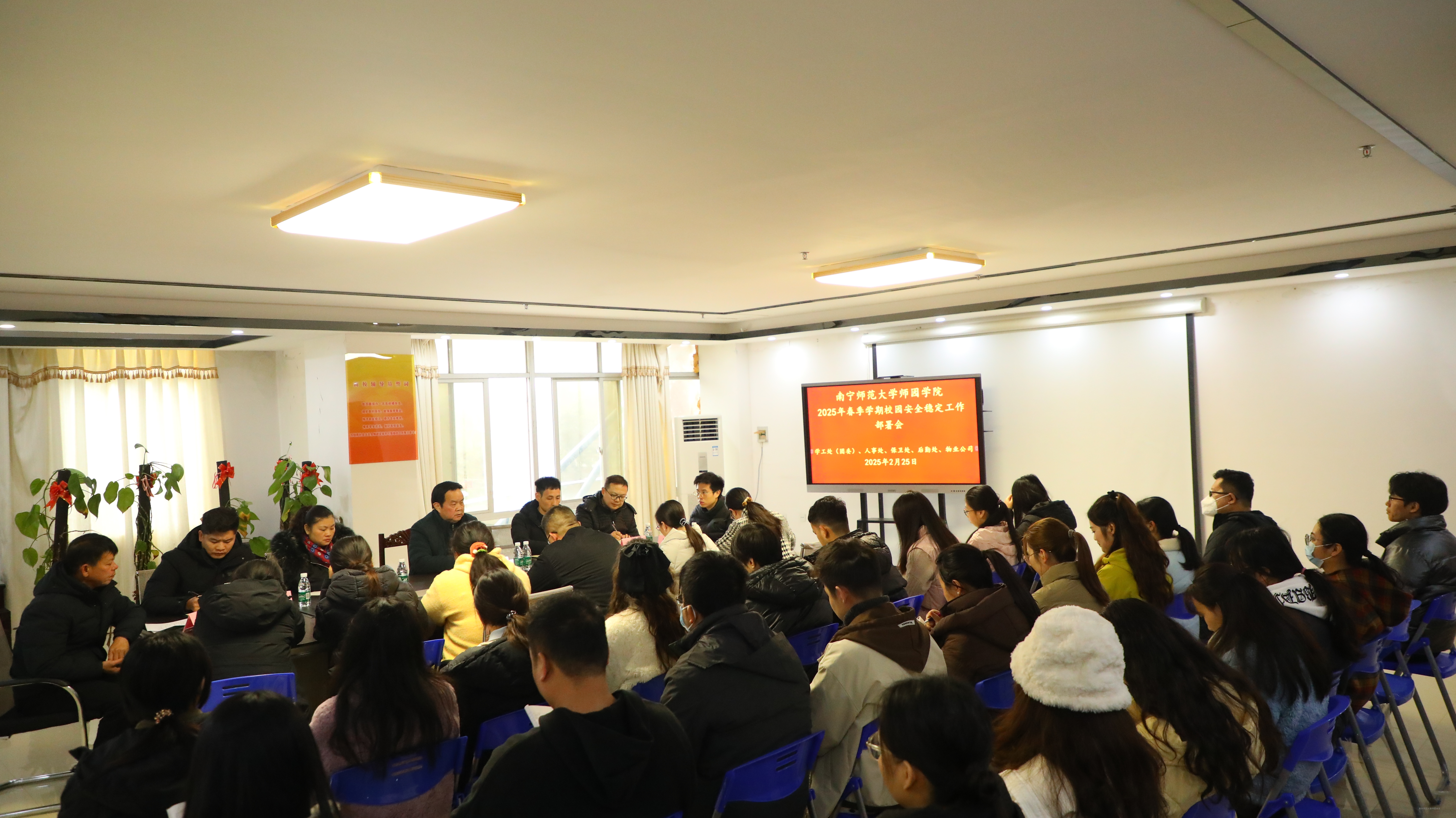 为了落实自治区党委政法委近期召开的“全区专题工作视频调度会”会议精神,维护鸭脖官网校园安全稳定,2月25日下午,学院党委副书记、常务副院长李剑喜召集人事处、学生工作处、校团委、保卫处、后勤处等负责人,物业公司代表以及学工(团委)系统全体人员在行政楼2楼202会议室召开2025年春季学期校园安全稳定工作部署会。会议由学生工作处处长叶栋主持。