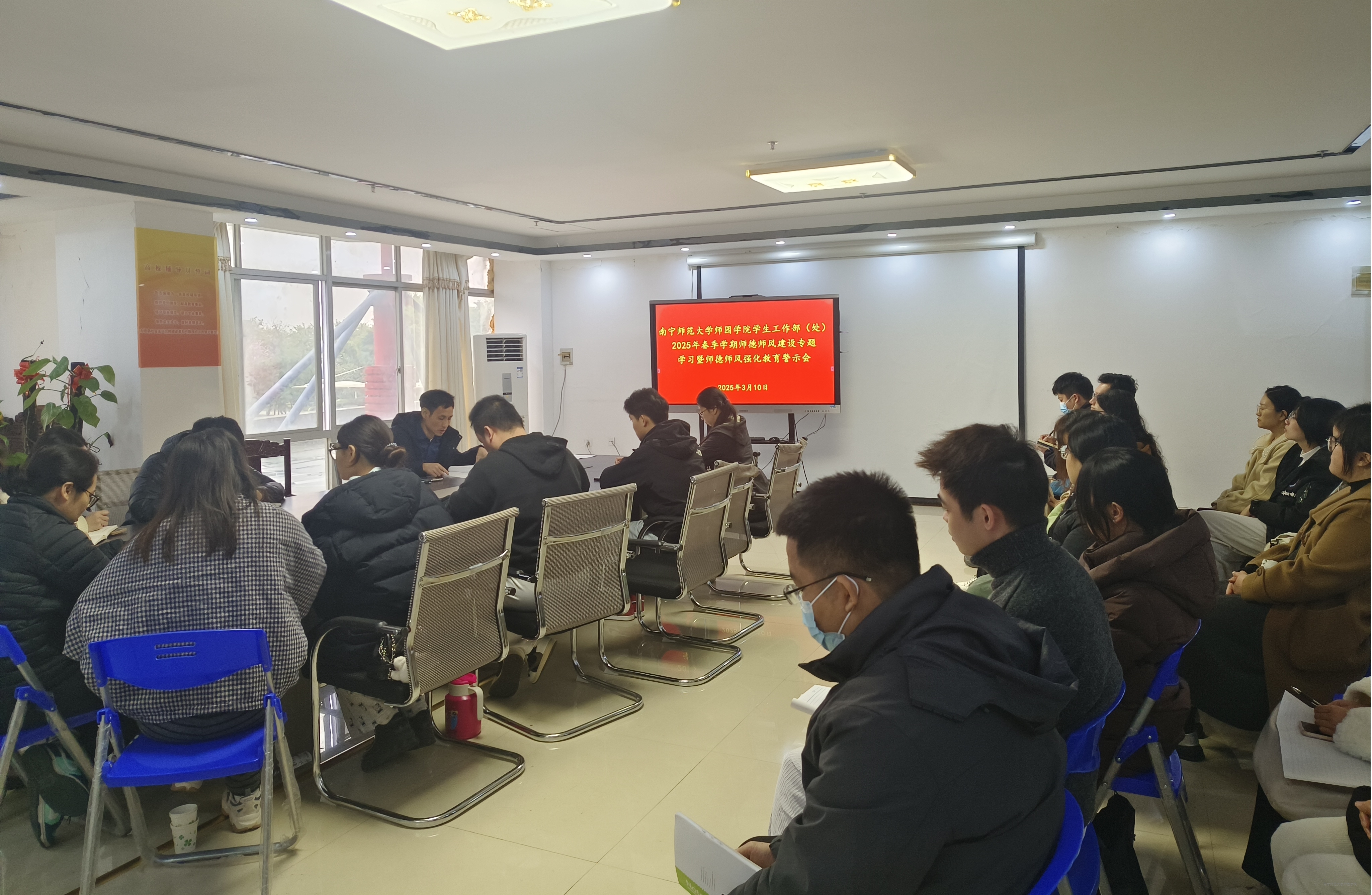 为深入学习贯彻习近平总书记关于教育的重要论述和全国、全区教育大会精神,进一步加强我院学生工作队伍师德师风建设,夯实立德树人根基,3月10日上午,学生工作部在行政楼202会议室召开学工队伍2025年春季学期师德师风建设专题学习暨师德师风强化教育警示会。此次会议由学生工作部长叶栋主持,学工(团委)系统全体人员参会。
