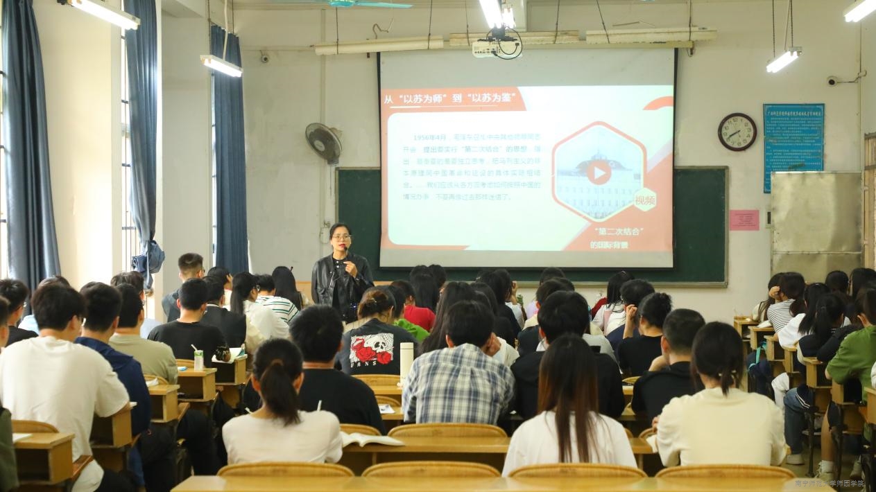 本次公开课由思政部专任教师莫彩霞主讲,授课内容为《社会主义建设道路初步探索的理论成果》。课上,莫彩霞老师带领同学们共同回顾梳理上一节课的知识点并以提问的方式导入新课。在新课讲授环节中,莫老师带领同学们深入了解了我国在进行社会主义建设道路初步探索的过程、《论十大关系》报告等相关内容,引导同学们进一步学习和领悟中国共产党在初步探索适合中国国情的社会主义建设道路过程中,在理论和实践上所作出的开创性贡献,为改革开放后开辟中国特色社会主义道路提供了理论准备和宝贵经验。