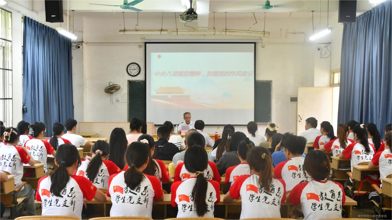 为深入贯彻中央八项规定精神学习教育,做到深学笃行、求真务实,6月13日下午,学院教学总督导卢敏秋在教学楼2-101教室为教育系全体党员师生讲授了一堂立意高远、导向明确的专题党课。
