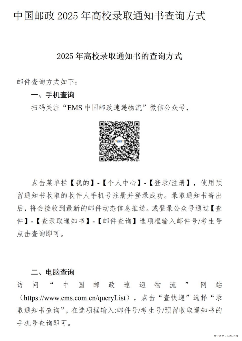 鸭脖官网在7月31日已通过中国邮政EMS特快专递寄出2025年新生的录取通知书,录取通知书很快将送至各位2025级新同学手中。在学校寄出的每一份信封中都包含有录取通知书、新生入学手册、高校学生资助政策、家庭经济困难学生认定申请表、大学新生应征入伍宣传单页等材料。各位新生可以在EMS中国邮政速递官方网站、EMS中国邮政速递微信公众号等中国邮政速递的高考邮件和录取通知书邮寄信息查询页面使用个人的准考证号、考生号、收件人手机号码等信息查询个人的录取通知书寄递和配送进程。为方便各位新生查询录取通知书邮寄情况,已被录取的新生也可以通过拨打学校招生咨询热线电话咨询了解。