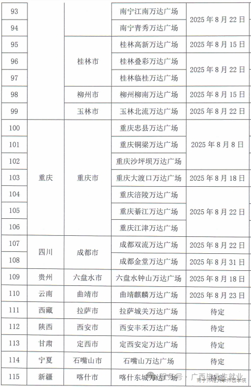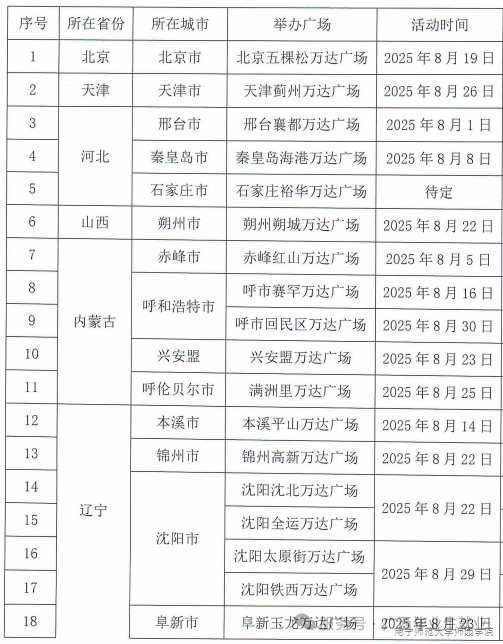 依托各地高校和全国万达广场:分东、西、南、北四个片区,开展“4+100”百城联动招聘会。活动在北京设主会场,并在广州、合肥、成都设片区分会场,同步在全国100座城市开展100场中小型招聘会。活动期间将举办企业招聘、实习推介、AI面试、政策解读、职业咨询等同期活动。