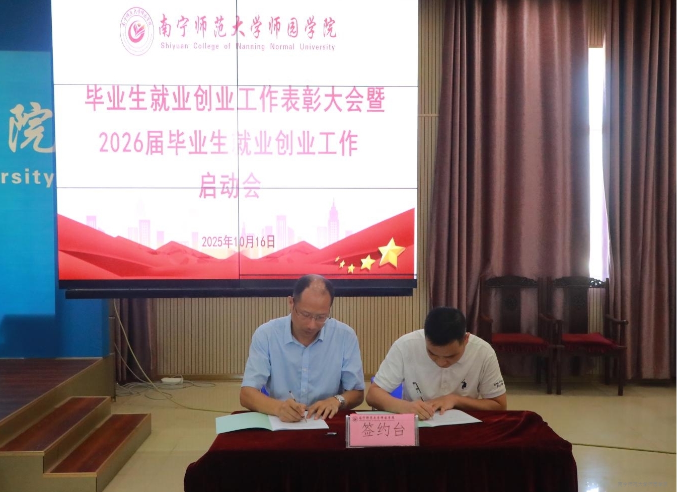 为做好鸭脖官网2026届毕业生就业工作,10月16日上午,学校在行政综合楼12楼第二报告厅召开毕业生就业创业工作表彰大会暨2026届毕业生就业创业工作启动会。学校董事长梁仲荣,校长尹文嘉,党委副书记梁秋(主持党委工作),副校长申书飞,纪委书记、副校长庞俊,副校长李德正,教学总督导卢敏秋出席会议。全体就业创业工作领导小组成员以及全体毕业班辅导员、毕业生就业创业工作获奖个人、招就处全体成员参加会议。会议由申书飞副校长主持。