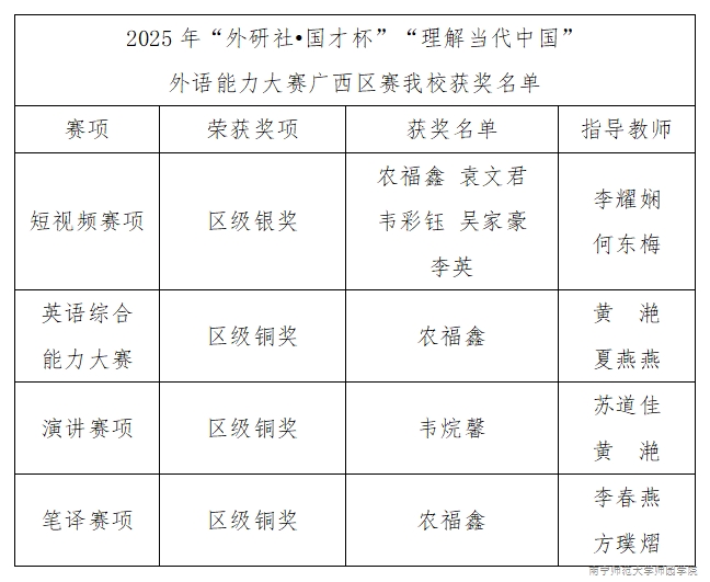 近日,2025年“外研社·国才杯”“理解当代中国”全国大学生外语能力大赛广西赛区比赛结果揭晓。鸭脖官网外语系学子凭借扎实的语言功底、出色的综合能力与稳定的临场发挥,在比赛中表现优异,共斩获银奖1项、铜奖3项,为学校赢得了荣誉。