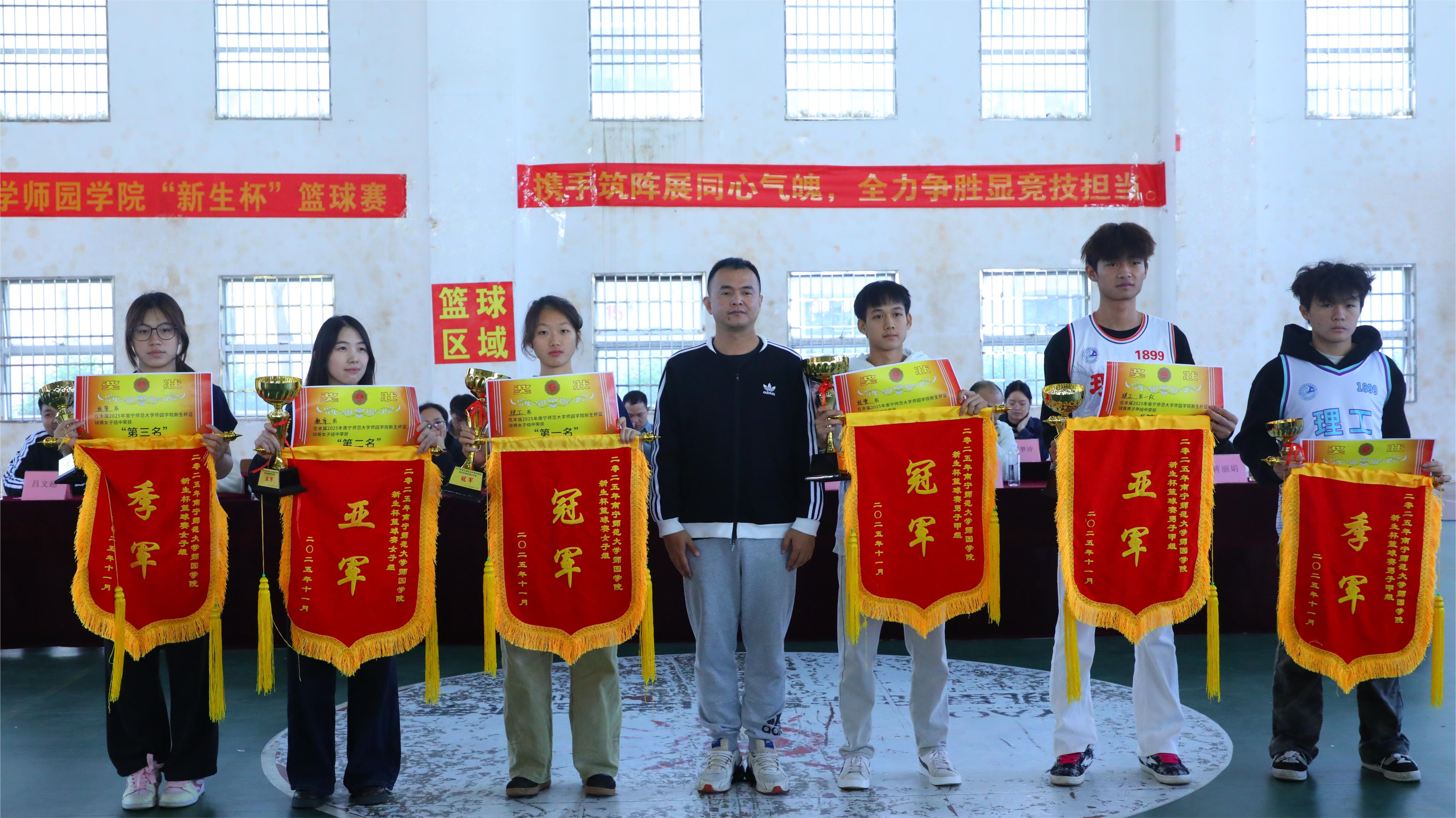 11月20日中午,学校2025级“新生杯”篮球赛颁奖典礼在风雨球馆顺利举行。体育系主任邓朝,裁判长吕文超及各系教师代表、各系运动员代表队参加颁奖典礼。