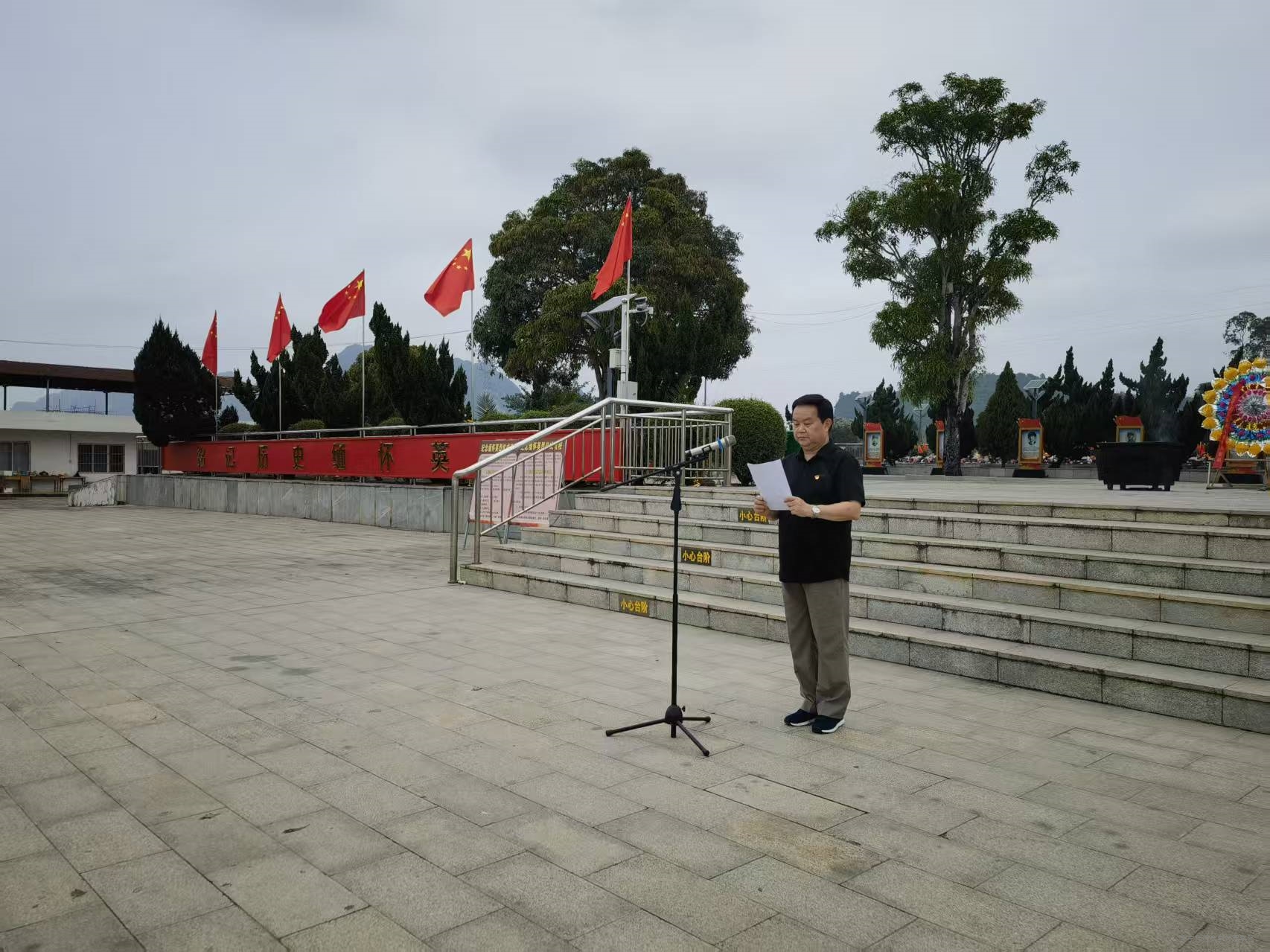 在龙州烈士纪念碑前,李剑喜常务副校长上前整理花圈缎带,带领全体人员缓步行至纪念碑前敬献鲜花,向革命先烈默哀,表达深切缅怀和崇高敬意。他表示,缅怀先烈遗志、汲取奋进力量,是新时代青年传承红色基因、砥砺初心使命的重要途径,对此,他向广大教师提出三点要求和希望:一是筑牢信仰之基,坚守育人初心。要以革命先烈为精神标杆,坚定理想信念,牢记为党育人、为国育才使命,把英烈精神融入师德师风建设,把个人理想追求融入教育事业,以坚定信仰引领学生成长。二是讲好红色故事,厚植爱国情怀。充分用好龙州红色资源,将英烈事迹、革命历史、边疆精神融入课堂教学与思政教育,通过多样化教学引导学生铭记历史,厚植爱党爱国情怀。三是汲取奋进力量,勇担时代使命。要把缅怀追思转化为干事创业的动力,把英雄精神转化为立足岗位的实际行动、履职尽责的强劲动力,着力培养德智体美劳全面发展的社会主义建设者和接班人。