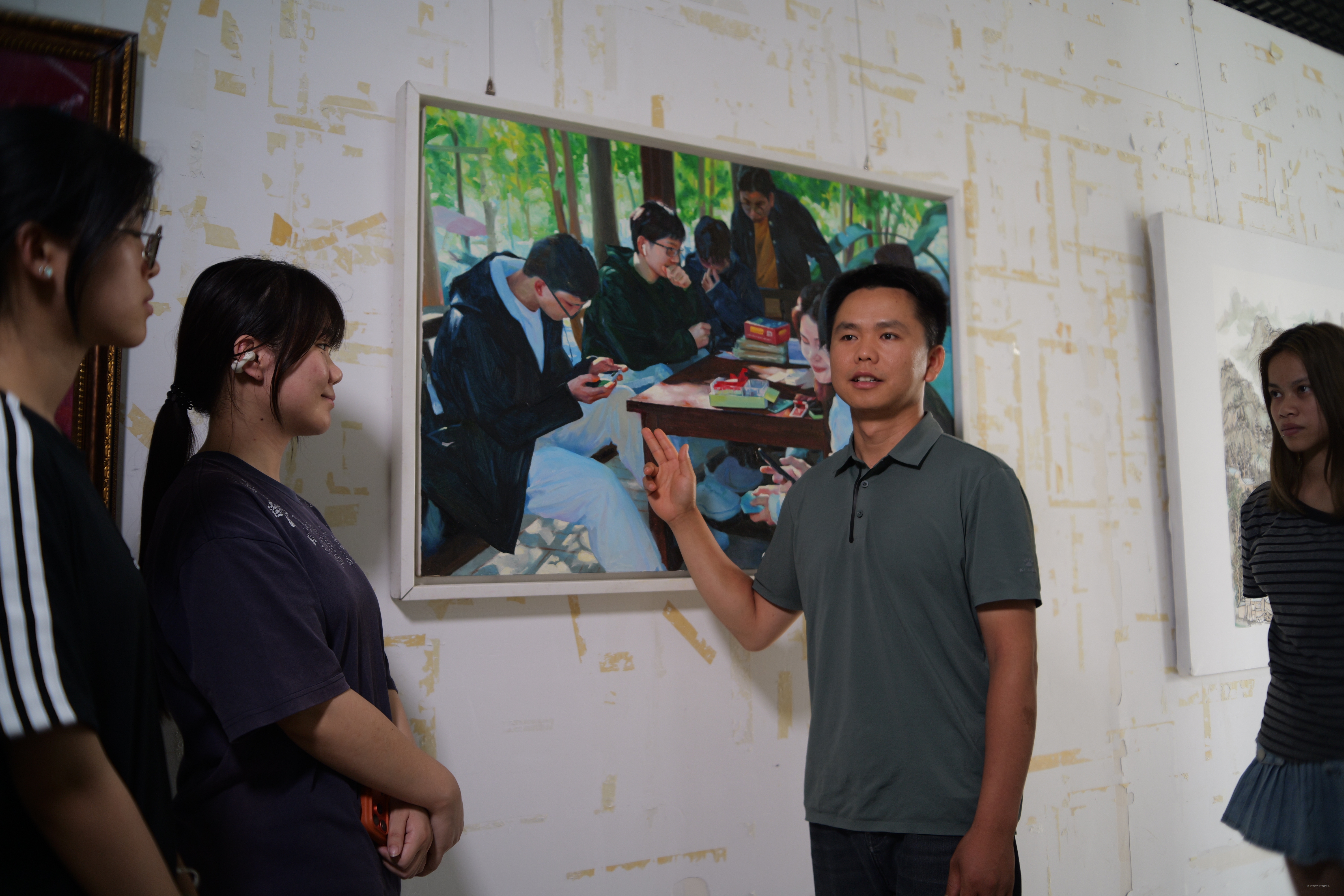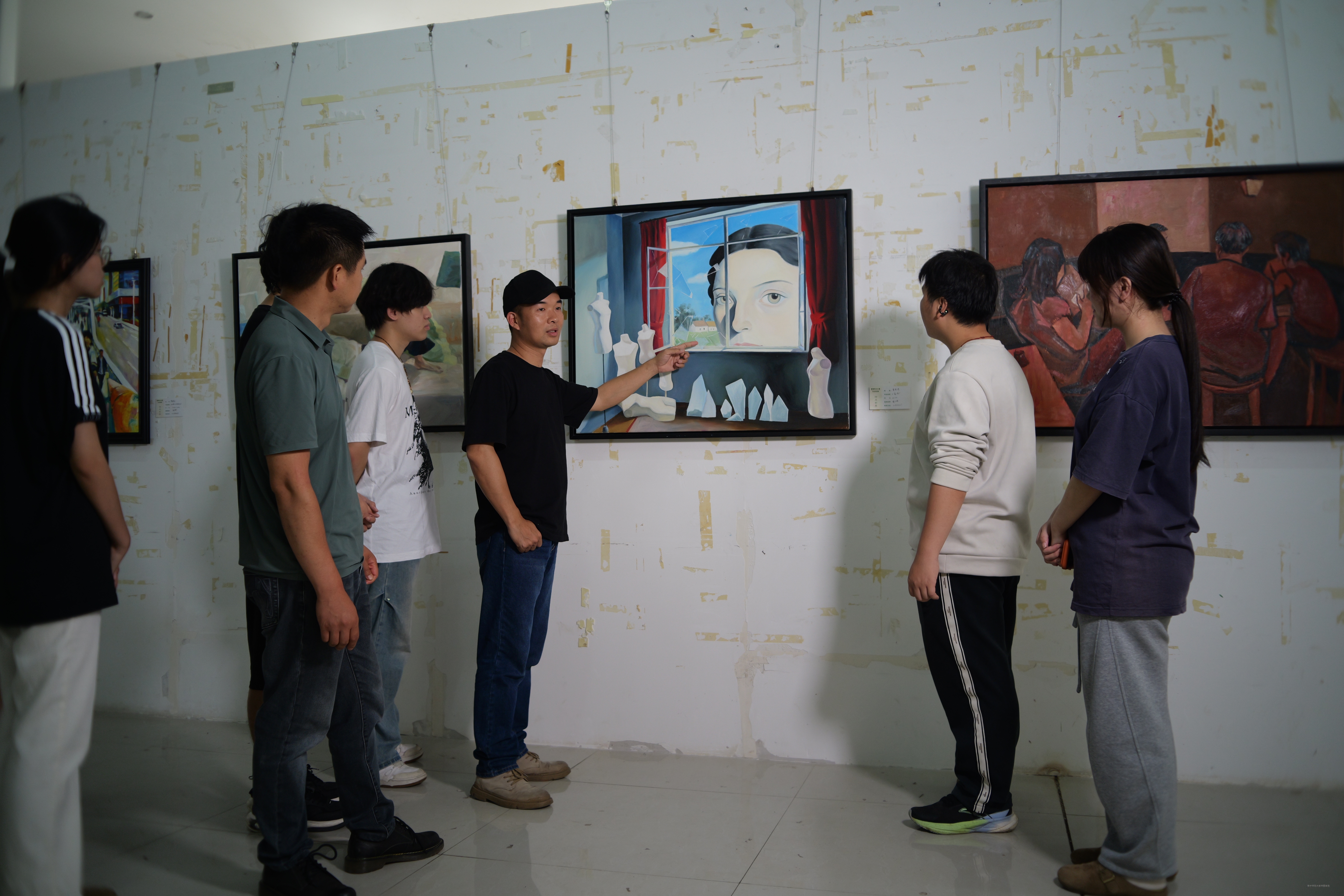 本次展览共展出美术作品53幅,其中油画27幅、中国画26幅。作品集中呈现了同学们四年来的学习积淀与创作思考,是学校贯彻新时代美育要求、推动“党建+思政+专业”融合育人的生动实践。作品主题鲜明、风格多元:既有表现边境木棉花及抗战历史的红色主题创作,也有以广西喀斯特地貌为描绘对象的乡村振兴题材山水画;既有展现徽州鱼灯、佤族竹编、京剧等非遗文化的作品,也有记录大学日常生活的青春叙事作品。这些作品,有的扎根传统、传承中华优秀文化,有的关注社会、紧扣时代脉搏,有的深入内心、抒发真挚情感。每一幅都承载着成长轨迹,生动体现了同学们在艺术创作中厚植家国情怀、坚定文化自信的自觉追求。