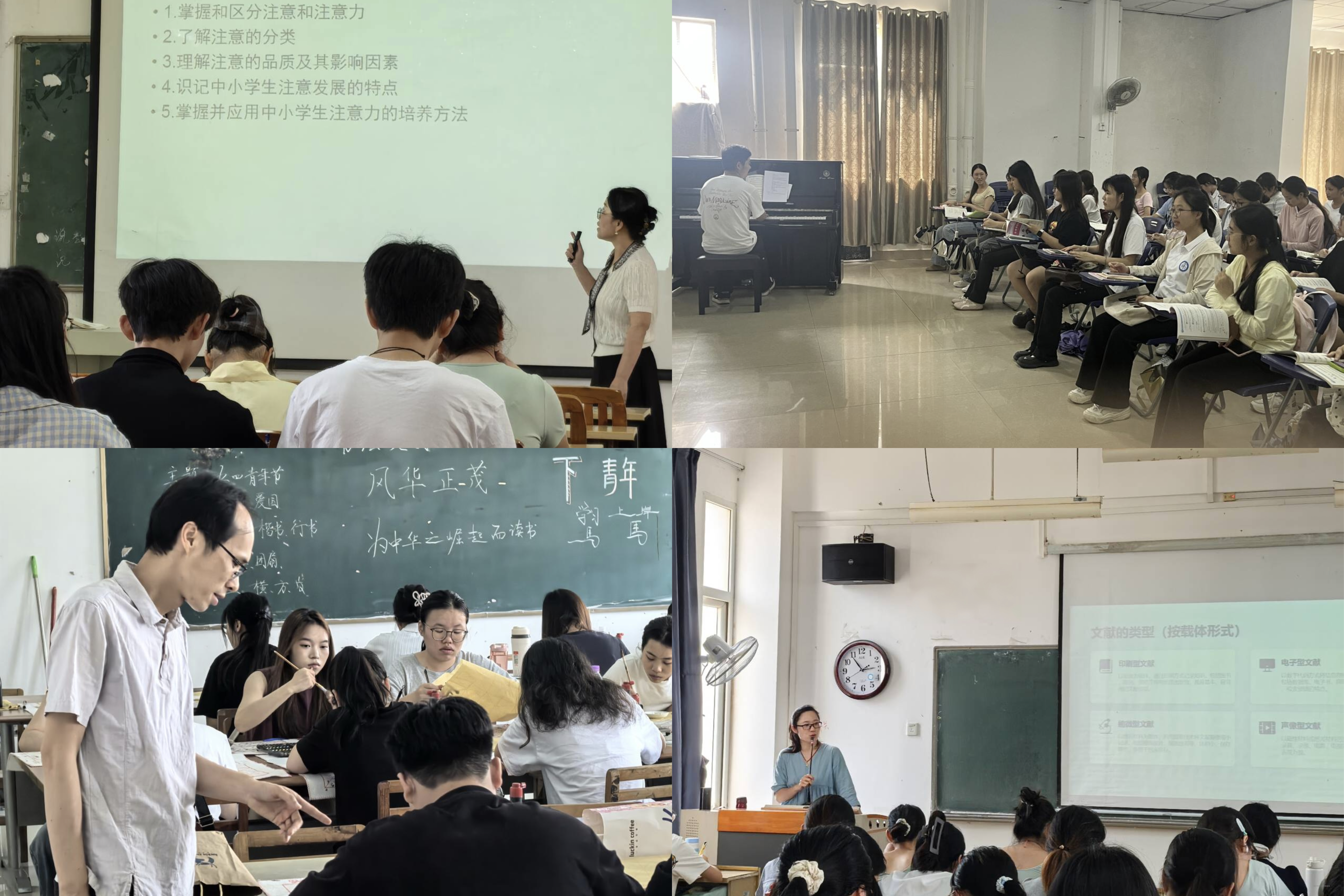 4月9日至24日,教育系推出2门教学公开课和2门教学观摩课,涵盖基础教育、心理学、艺术学等多个领域,充分展现了教师扎实的教学功底和积极创新的教学风貌。在观摩课环节,由植子伦副教授主讲《小学教育研究方法》,聚焦“文献检索的查阅与利用”,紧扣小学教育科研实操需求,系统讲解文献检索路径、筛选规范与高效利用方法,注重理论结合实操,引导学生掌握规范的文献梳理与学术引用技巧。檀俊副教授主讲的《教育心理学》以“广西三月三”文化特色为切入点,引导学生思考心理学知识如何服务于国家战略和民族地区教育发展,有效培养了学生的家国情怀和服务意识。在公开课环节,石浩老师主讲的《乐理视唱(一)》围绕“节拍与拍子类型”展开教学,通过理论讲解、节奏示范与视唱练习,系统梳理不同节拍的特点与演唱要点,帮助学生准确把握节奏韵律。陈永前老师主讲的《书法文创》,详细讲解书法章法在文创载体上的应用,重点指导学生如何在书签、团扇等载体上合理构图、巧妙留白,充分展现了教育系多样化的教学特色与扎实的教学水平。