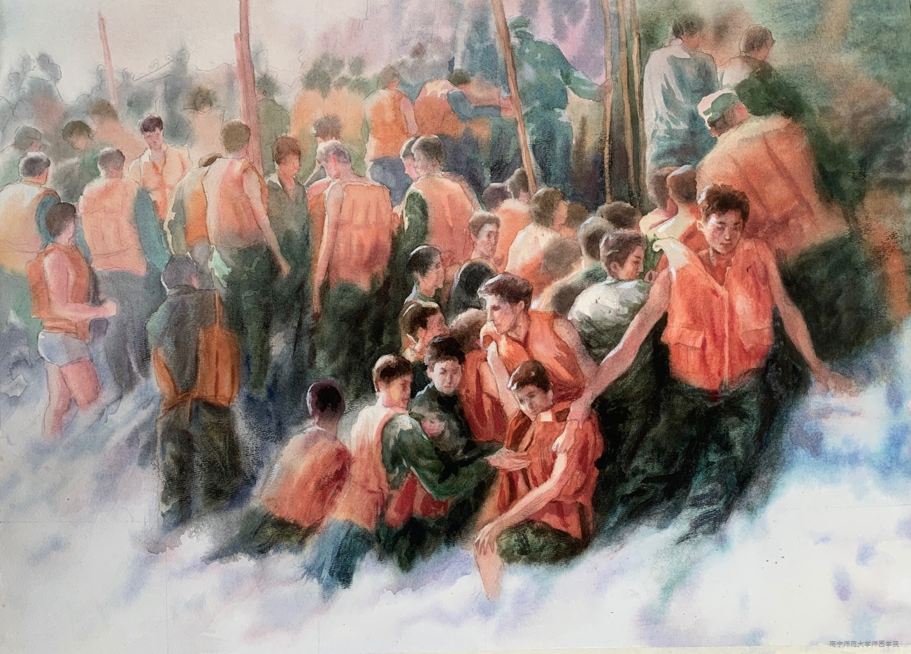 作品题目:《走过严冬——记抗疫大学生志愿者》作者:零敏(艺术系2018级美术学专业水彩方向)