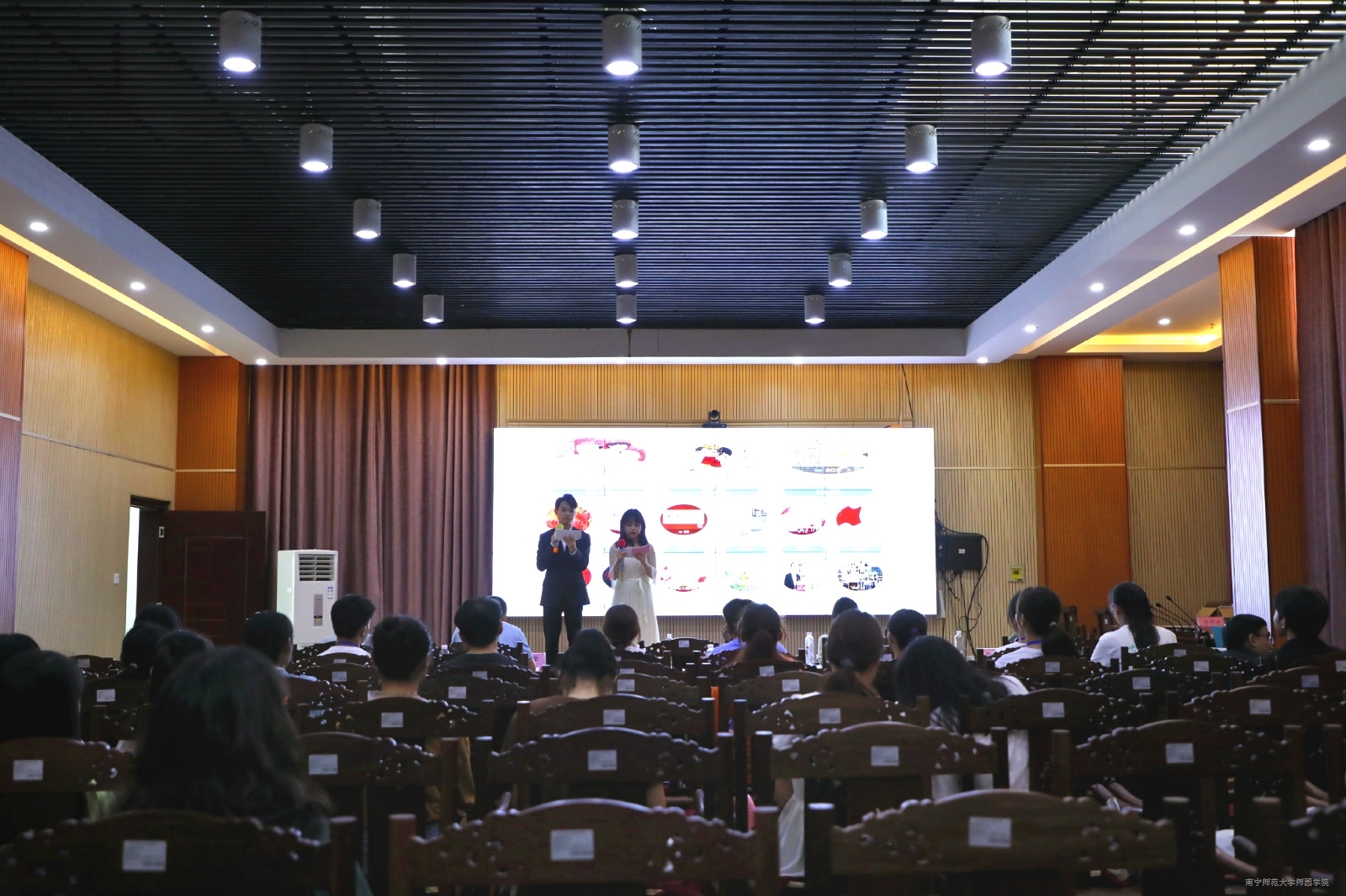 决赛现场,各参赛队伍通过播放精心创作的PPT视频,用不同视角和表达手法,向观众展现了对党的奋斗历程的认识和光辉历史回顾,表达了对党的热爱与敬仰。同时部分参赛队伍也通过以“坚定文化自信,展示璀璨民族文化”为参赛主题而进行创作的PPT视频展现了壮族传统节日、传统美食等民族文化,向观众们形象地展示了壮族丰富多彩的文化生活,从而进一步坚定了文化自信。决赛历时三个小时,最终在评委老师及大众评委公平公正的评选下,最终评出了一等奖1组,二等奖2组,三等奖5组。